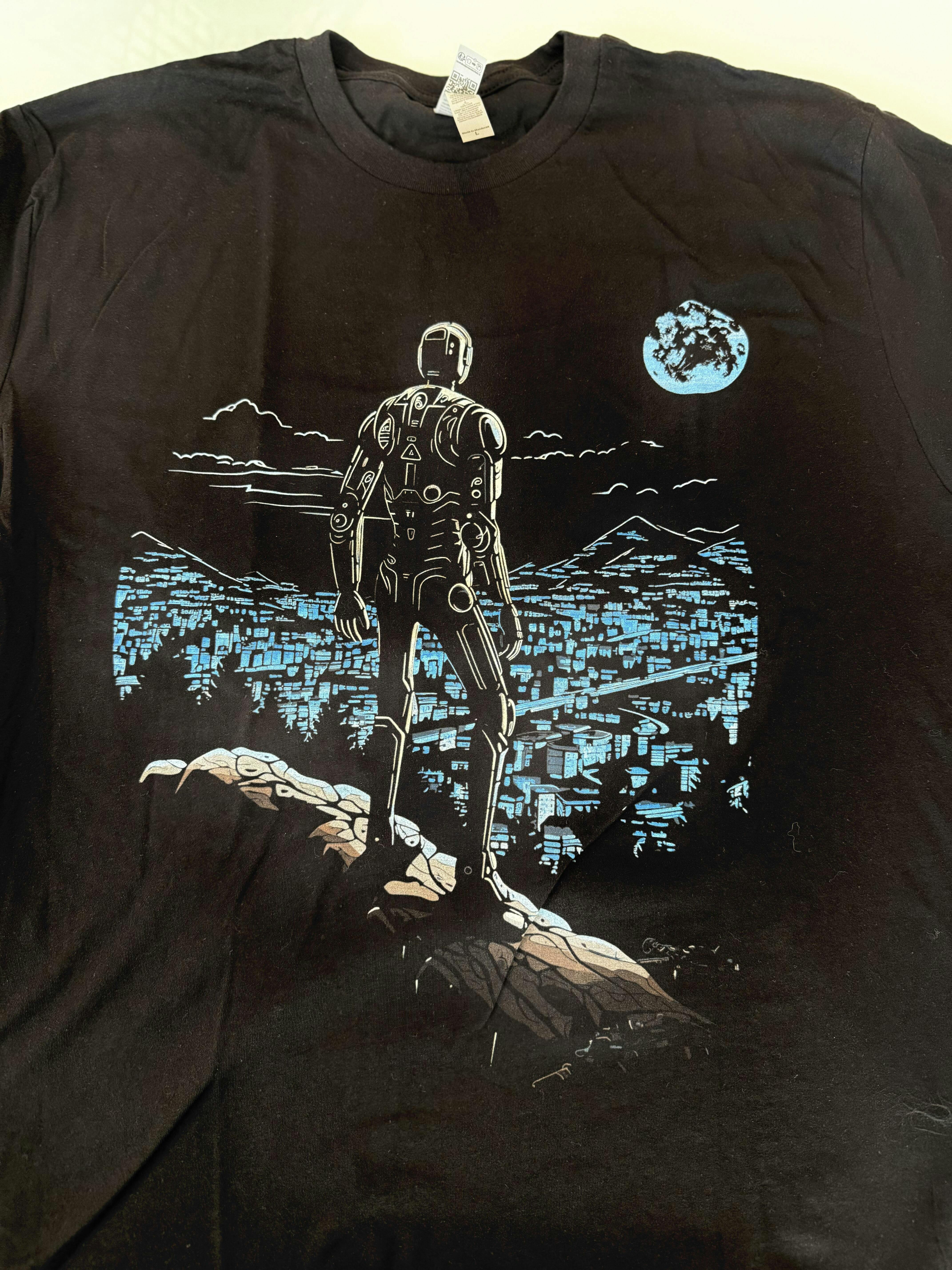 Robot observing the city landscape T-shirt, Technology Robotics A.I. Revolution, Machine Rebellion, Men's Tee
